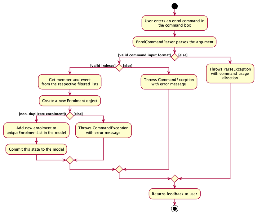 Expected: First member is enrolled to first event. Enrolment details shown in the result display. Command box is cleared. - For other positive test cases, try