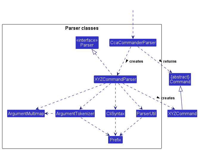 XYZCommandParserclasses (e.g.,CreateMemberCommandParser,DeleteMemberCommandParser, …) inherit from theParserinterface so that they can be treated similarly where possible e.g, during testing.